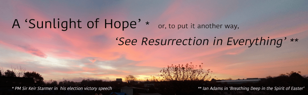 As we woke up on the dawn after election day with a new Prime Minister, Sir Keir spoke about a ‘sunlight of hope’ emerging from the shadows and he restated his focus on public service. Tim Farron, a Christian and Lib Dem MP speaks of politics as a ‘mucky business’ . He encourages us both to get involved in local life and pray for our MPs