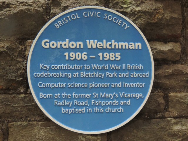 On 26th September 2016 the blue plaque shown was placed on the wall outside the Sacristy at St Mary’s Church, Fishponds, Bristol, in honour of Gordon Welchman.
